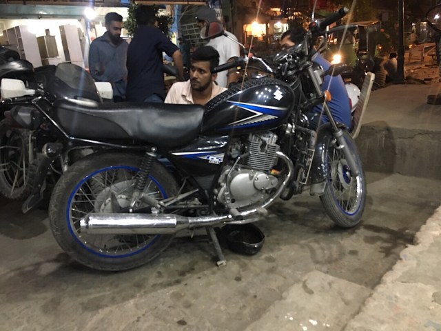 In Lahore angekommen, hatten wir am Abend zuvor einen Twinliebhaber kennengelernt. Das grelle, für Pakistan unbekannte Licht der Twin, hatte für Aufmerksamkeit gesorgt. Hassan ist von den pakistanischen Motorradfahrern TLC – Tourers, Loosers, Crouisers. Hassen teilte ich mein Problem mit der dann daraufhin all seine Freunde anrief. Alle, heißt ALLE !!. Wir fuhren zusammen durch Lahore zu seinem Freund. Im Anschluss hat sein Freund, weitere Freunde angerufen. Das wiederum war schlicht weg eine Kettenreaktion. Ungefähr 3 Std. telefonierte jeder mit jedem, welcher ein Heavy Duty Bike in Lahore, gefühlt in ganz Pakistan, besaß.