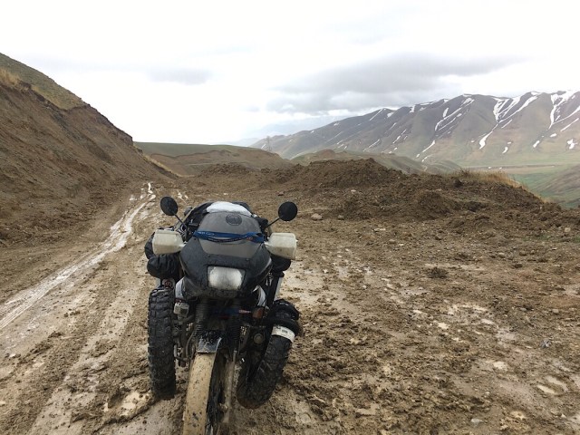 Es hatte in der Nacht ein wenig geregnet, zum Zelt Abbau aber zum Glück aufgehört und wir fuhren gemütlich los. Die Koffer gefixt vom Vortag und über Kosh-Dobo in Richtung Kazerman und Dschalalabad. Doch soweit sollte es nicht kommen. Es fing vor Kosh-Dobo an zu regnen und nicht nur so ein bisschen, sondern so richtig. Da es die Tage vorher auch schon an der Stelle regnete ging es in ein feuchtes Schlammvergnügen über. Die Bikes waren sehr schwer, am Pass oben waren noch Schneeberge am Rande der Straße und wir mussten „nur“ noch über diesen Hügel. Über ein tiefes Schlammloch, an dem LKW´s vorher anhielten, um ihre Schneekette zu montieren, wie ich später feststellen durfte. Diese Passage brach mir das Genick und meine Kupplung war komplett tot, sodass kein weiterer Antrieb mehr möglich war. Also 0 Meter, auch auf Asphalt. Da stand nun die Alp: