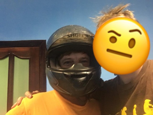 Der, ich nenne ihn mal „Würger“ – Der Würger kam und wollte unbedingt sich entschuldigen. Sehr wahrscheinlich von seinem Koch angestachelt. Er ließ es sich nicht nehmen mich zu umarmen und sich somit auf seine Art und Weise bei mir zu entschuldigen. Natürlich habe ich diese Entschuldigung angenommen. Er bewunderte meine Ausrüstung, speziell den Helm.  Also zog ich ihm den Helm auf und machte ein Selfie 🙂