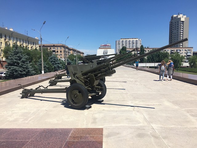 Geschütze der damaligen Zeit auf dem Museumsgelände gegenüber dem zerschossenen Gebäude